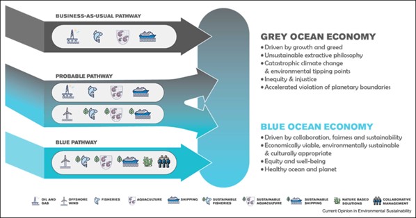Transitioning to a blue economy requires a rapid increase in renewable energy, a steep decline in hydrocarbon production, improvement in sustainability of fishing and shipping, and decreased waste from land-based agriculture and coastal cities – all supported by policy that encourages more sustainable practices.